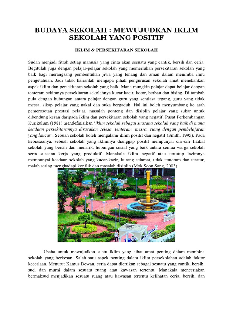 Budaya Sekolah from imgv2-1-f.scribdassets.com Step persekitaran luaran mikro (khusus): Memupuk budaya penyayang di sekolah. • sekolah yang selamat memerlukan penglibatan masyarakat. Motivasi dan galakan berbentuk ganjaran. 3.2 kepimpinan distributif dan persekitaran sekolah kepentingan kepimpinan distributif dalam mengukuhkan kualiti persekitaran sekolah turut diperbincangkan oleh sarjana seperti noble (2014), oduro (2004), leithwood, day, sammons, harris, dan hopkins (2006), serta margolis dan huggins. Oleh itu dapatlah pihak sekolah menjalankan dan mengamalkan persekitaran sekolah dan persekitaran bilik darjah yang mesra budaya. Persekitaran kawasan dan bangunan akan kelihatan menarik dan disenangi sekiranya manusia berada di kawasan yang mengamalkan budaya sihat. • budaya adalah hak masyarakat.