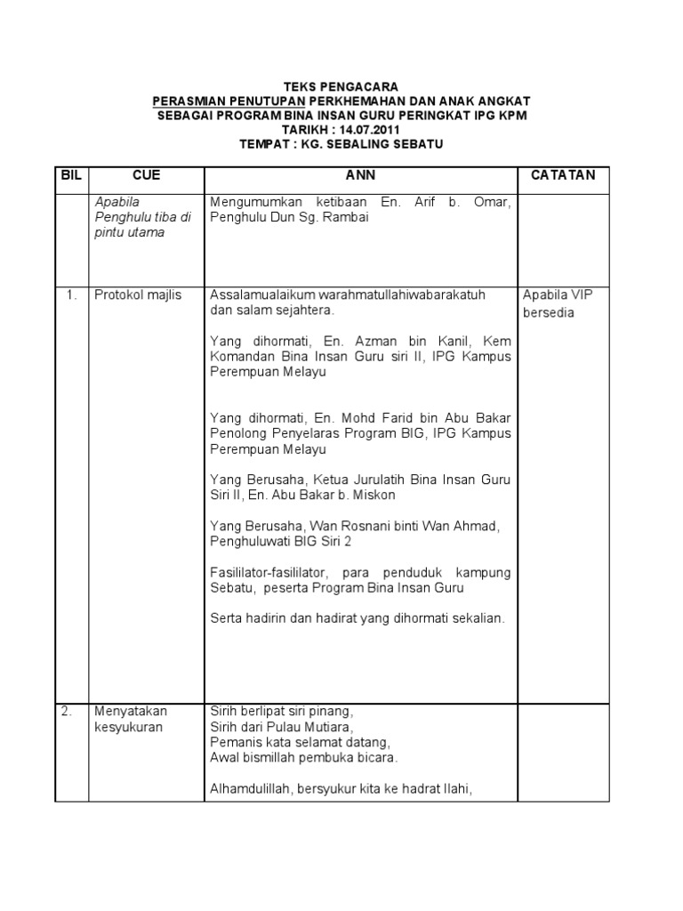 We are a sharing community. Teks perasmian mesyuarat agung pibg. Teks ucapan pengacar pengacara a majlis sambutan samb utan hari guru smk dato' dato' idris 2016. Begitu juga dengan majlis kita pada hari ini sebagaipenutup bicara, sisir pelepah meraut lidi, menganyam daun atap jerami, yang indah, yang berseri bawalah pergi yang cacat yang keji. So please help us by uploading 1 new document or like us to download