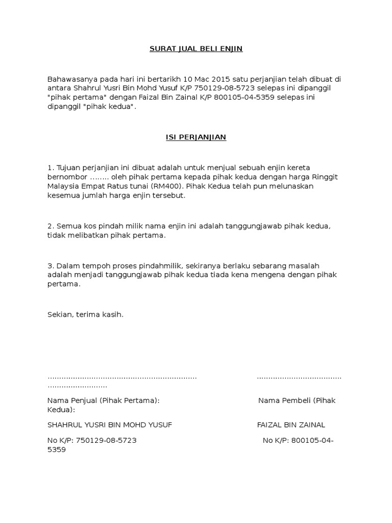 Surat Perjanjian Jual Beli Kereta A Doc Document from demo.vdocuments.mx Asalkan kedua2 setuju dan ada tandatangan, surat tu akan sah secara otomatik. Kalau lagi proses membeli atau menjual suatu barang, kita perlu membuat surat perjanjian jual beli. Contoh surat perjanjian jual beli kenderaan roderickrosari2 s blog. Dalam surat perjanjian jual beli tanah ini disebut sebagai pihak pembeli. Berikut ini adalah contoh surat perjanjian jual beli terutama kapal, contoh ini sudah disesuaikan dengan materi sma kelas 2full description. Perjanjian jual beli, perjanjian sewa menyewa. Bukti transaksi dibuat berdasarkan nilai dari barang yang diperjualbelikan. Perjanjian jual beli ini dibuat pada hari _ , tanggal _ oleh dan antara :