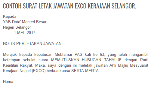 Satu kata ,satu hati, satu aksi: Perkara di atas adalah dirujuk. Hari terakhir perkhidmatan saya akan tamat pada 31 ogos 2018 mengikut kontrak sedia ada. Sudah semestinya satu perkara yang anda perlu buat sebelum berhenti kerja adalah menulis surat perletakan jawatan secara rasmi. Warisan akan serah surat peletakan jawatan adun sebatik kepada speaker dunparti warisan sabah (warisan) akan menghantar surat peletakan jawatan hassan a.