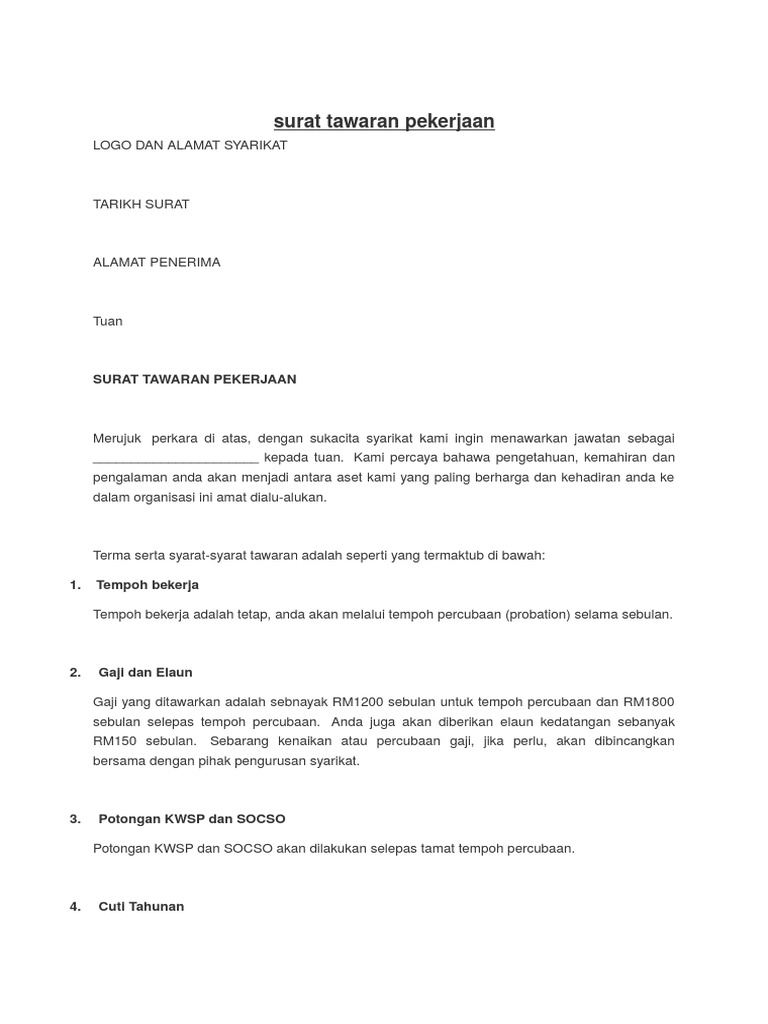 Semoga perusahaan anda bersedia menjadi distributor resmi produk kami. Walaubagaimanpun contoh surat tawaran kerja dibawah akan memudahkan pencarian anda. Di samping itu, anda mesti membiasakan diri dengan peruntukan yang biasa dalam surat tawaran supaya anda boleh mengelakkan merangka kontrak kerja tersirat. Komponen yang harus dilihat dalam surat kontrak kerja karyawan swasta. Demikian kami sampaikan surat penawaran kerja sama ini. Pada pembahasan contoh surat kontrak kerja yang merupakan poin penting dalam banyak kegiataan, karena menurut gawe cv, pembuatan surat perjanjian perlu untuk dikuasai dalam setiap bidang aspek kegiatan. Gajigaji yang ditawarkan adalah sebanyak rm800 sebulan untuk tempoh percubaan dan rm1000 sebulan selepas tempoh percubaan. Alasan yang jelas dan jujur yang disampaikan ini juga bisa menjadi sebagai bahan pembelajaran mereka dalam memperbaiki kontrak penawaran kerja yang ada. Tawaran kerja kontrak part timetu minngfull description. Surat lamaran kerja memiliki format dasar yang hampir mirip dengan surat surat lainnya antara lain. Jika anda merasa cocok dengan tawaran kerjasama tersebut, maka anda bisa membalasnya dan menanyakan demikian kontrak ini dibuat dan diselesaikan pada hari dan tanggal seperti tersebut pada bagian awal kontrak ini. 1 perjanjian kerja karyawan kontrak pada hari ini, tanggal bulan tahun telah diadakan perjanjian kerja antara: Surat perjanjian kontrak kerja service komputer ini dibuat rangkap 2 (dua) diatas kertas bermatrai cukup dengan mempunyai kekuatan hukum yang sama.